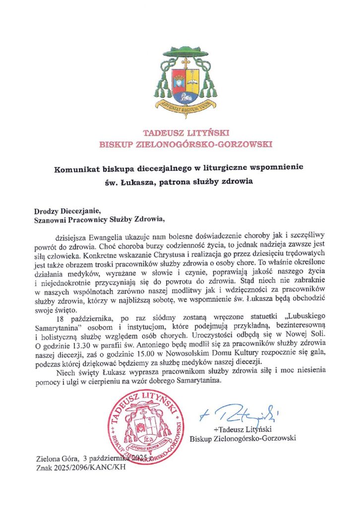 Komunikat biskupa diecezjalnego na święto św. Łukasza